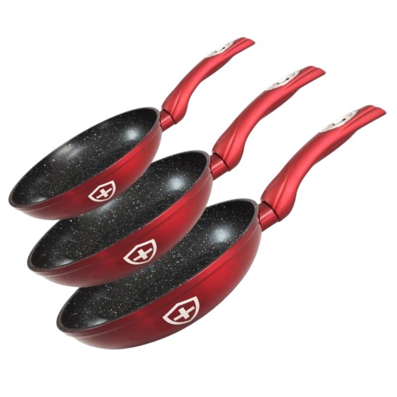 | Descripción | Set de 3 sartenes color rojo interior negro con recubrimiento Greblon®, base turbo inducción y mangos Soft Touch. Apto para todo tipo de estufas. |
